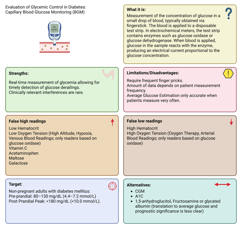 Accurate evaluation of glycemic control is a cornerstone of diabetes management. It provides insights into treatment efficacy, patient adherence, and forms the foundation for therapy adjustments. The major dimensions of glycemic control include average glucose levels, hypoglycemia frequency, glucose variability, and sensor-based metrics such as “time in range.” The most widely applied tools to assess these domains are hemoglobin A1C (A1C), capillary blood glucose monitoring (BGM), and continuous glucose monitoring (CGM), each offering unique strengths and inherent limitations due to how the data are generated.