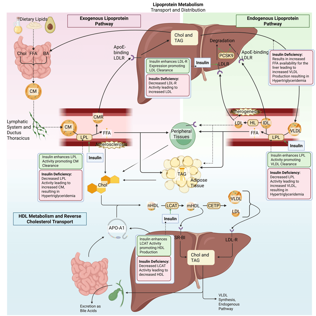 Insulin also broadly regulates lipoprotein composition by supporting hepatic LDL receptor activity and promoting HDL formation. Consequently, insulin deficiency reduces LDL clearance and lowers HDL cholesterol levels..