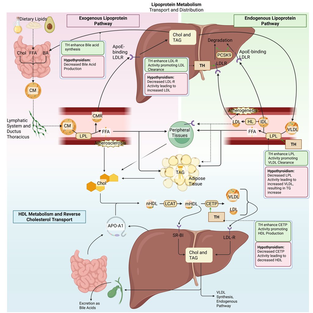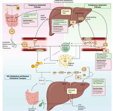 Thyroid hormones enhance hepatic LDL receptor expression, increasing LDL clearance, and stimulate cholesterol 7α-hydroxylase, promoting bile acid synthesis. Thyroid hormones increase Lipoprotein Lipase (LPL) activity, promoting VLDL Clearance. They also promote HDL production by maintaining Cholesteryl ester transfer protein (CETP) function.
