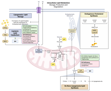 Pathophysiology: GH deficiency reduces these lipolytic and metabolic effects, leading to increased fat accumulation, particularly visceral adiposity and hepatic steatosis.