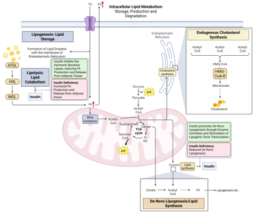Pathophysiology: Insulin deficiency or impaired signaling leads to a loss of this anti-lipolytic effect, increasing adipose tissue lipolysis and raising FFA flux to the liver. This altered substrate availability subsequently impacts lipoprotein metabolism, as discussed below.