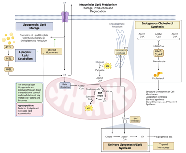 Pathophysiology: Hypothyroidism reduces these effects, leading to lower fatty-acid oxidation, decreased triglyceride hydrolysis, and impaired intracellular lipid turnover resulting in reduced lipolysis and increased lipid accumulation.