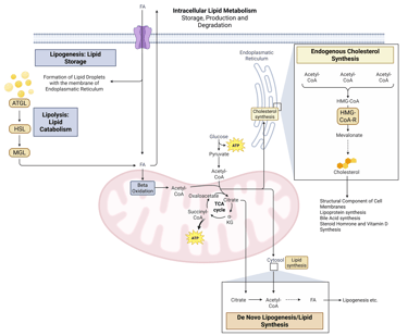Detailed Illustration of intracellular Lipid Metabolism. HMG-CoA-R: HMG-CoA-Reductase, ATGL: Adipose Triglyceride Lipase, HSL: Hormone Sensitive Lipase, MGL: Monoglyceride Lipase, FA: FAtty Acids