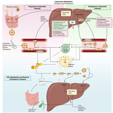 GH normally upregulates hepatic LDL receptor expression and reduces PCSK9, enhancing LDL clearance. This also facilitates the hepatic uptake and catabolism of VLDL and its apolipoprotein B-100 (apoB-100) component, leading to increased VLDL clearance.