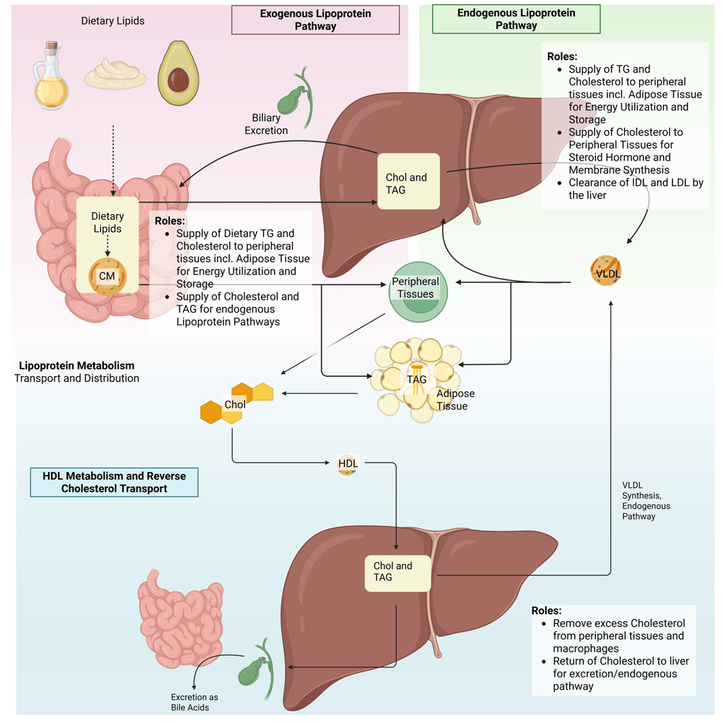 The illustration below depicts the key components of the three major lipoprotein pathways. In the sections that follow, we will examine each pathway in greater detail.