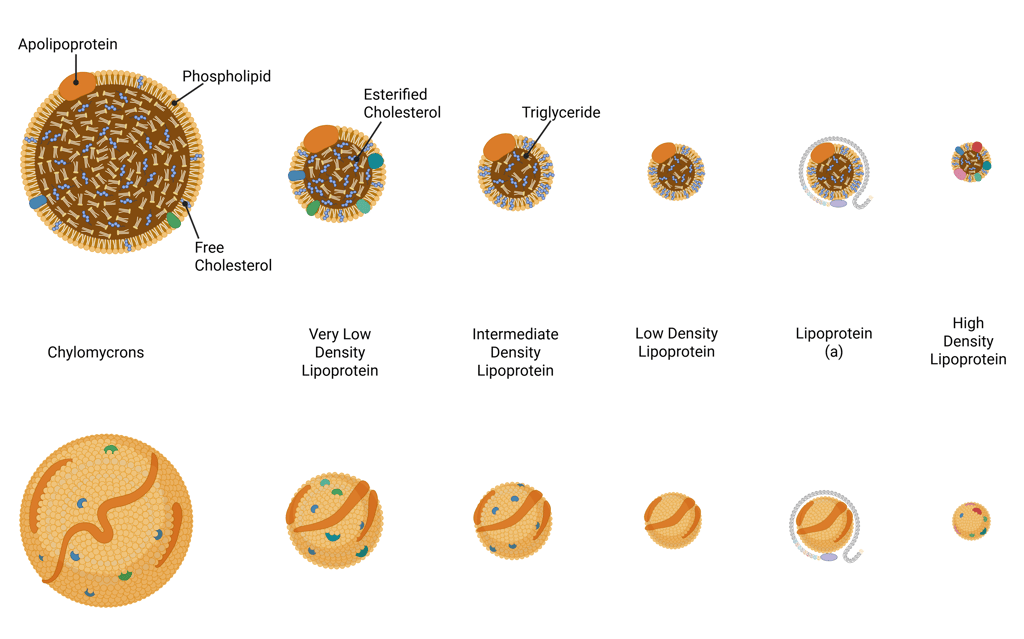 Lipoproteins consist of a hydrophilic surface layer composed of phospholipids, free cholesterol, and apolipoproteins, which encase a hydrophobic core containing cholesteryl esters and triglycerides. Based on size, lipid, and apolipoprotein composition, lipoproteins are classified into different classes: chylomicrons, VLDL, IDL, LDL, HDL, and lipoprotein(a) (Lp(a)).