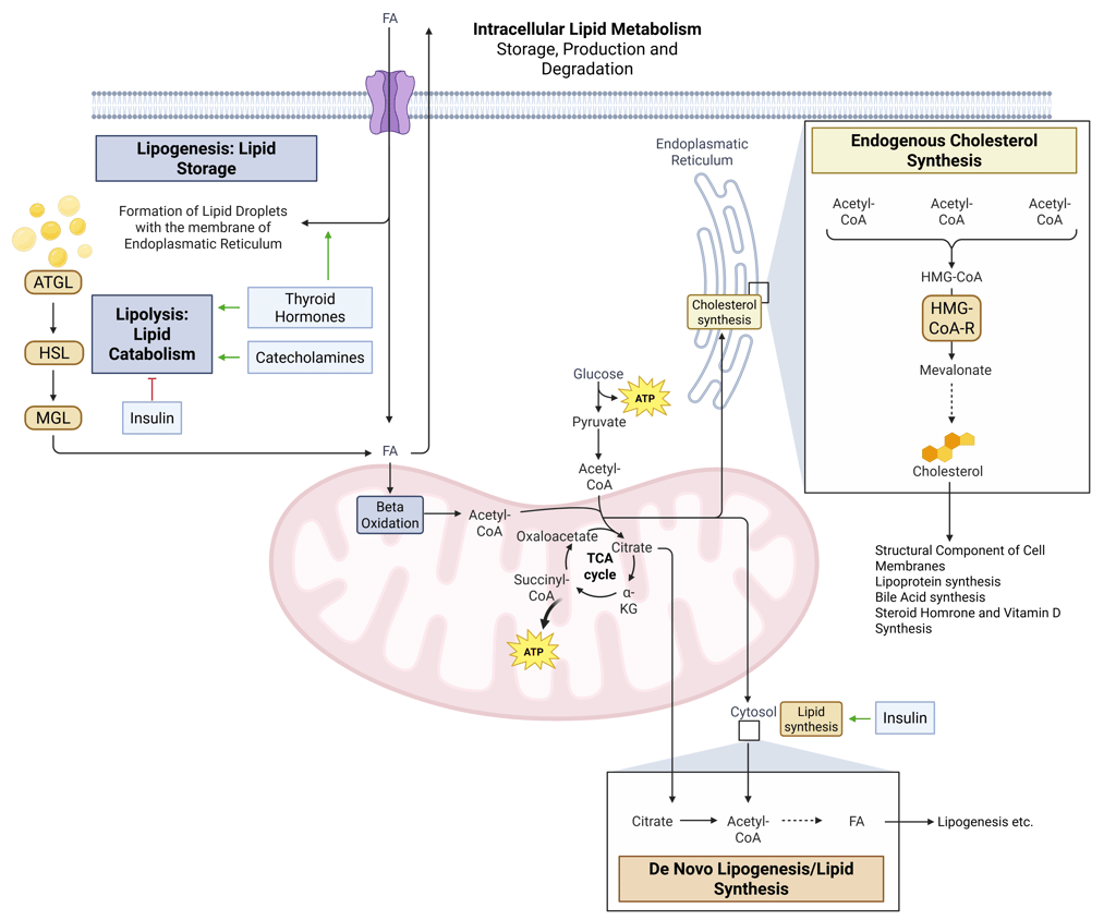 Lipid metabolism can be understood as comprising two interdependent components. The first is lipoprotein metabolism, which governs the transport and distribution of lipids between the liver, intestine, and peripheral tissues. The second is intracellular lipid metabolism, encompassing the synthesis, storage, and breakdown of lipids to provide energy locally within cells or to supply distant tissues. These two facets are tightly linked, as intracellular lipid processes generate substrates that enter the circulation via lipoproteins, while circulating lipids influence cellular lipid handling.