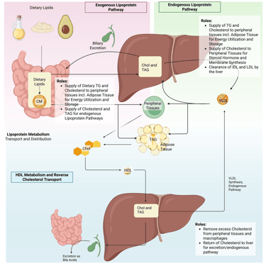 The liver plays a central role in clearing chylomicron remnants from the bloodstream. Apo E on the remnant surface binds to hepatic LDL receptors and related receptors to mediate uptake. Through this coordinated process, the exogenous pathway efficiently transports dietary triglycerides to muscle and adipose tissue for energy utilization and storage. In individuals with normal lipid metabolism, it can move more than 100 g of dietary fat per day without causing substantial elevations in plasma triglyceride levels. Dietary cholesterol, on the other hand, is primarily delivered to the liver, where it may be incorporated into VLDL, converted into bile acids, or secreted back into the intestine via the biliary pathway.