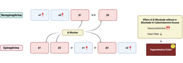 Illustration: unopposed α-adrenergic vasoconstriction in β-blockade therapy before α-blockade therapy in catecholamine excess