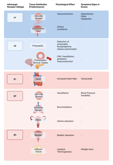 Illustration of adrenergic receptor subtypes, their effects upon activation and symptoms in excess. Sweating is another inportant symptom of catecholamine excess, not illustrated here. It is the result of the increased catecholaminesacting on α1- and β-adrenergic receptors in the skin and sweat glands, with both peripheral and central mechanisms contributing to increased diaphoresis.