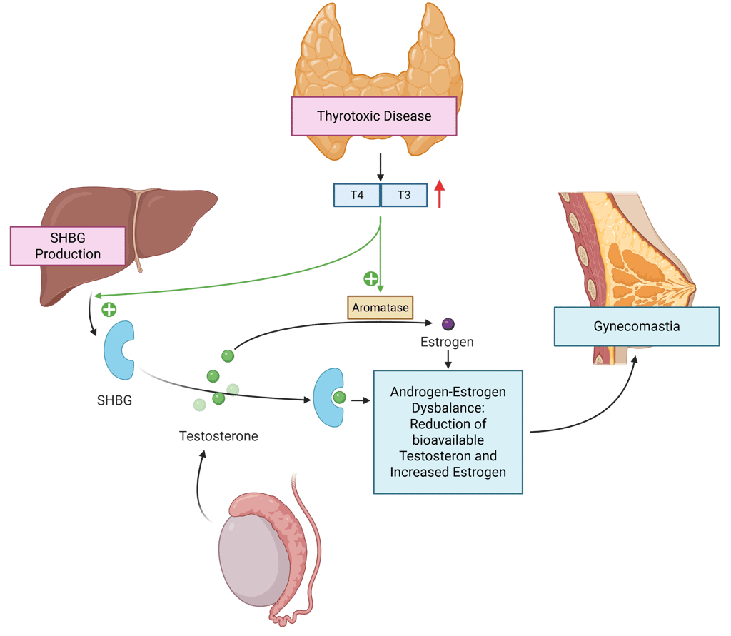 Gynecomastia may be a sign of thyrotoxicosis resulting from an androgen–estrogen imbalance driven by two primary pathogenic mechanisms: (1) thyroid hormone–induced elevation of hepatic sex hormone–binding globulin (SHBG) production, which reduces the bioavailability of androgens, particularly testosterone; and (2) increased aromatase activity, which enhances the conversion of testosterone to estrogen.