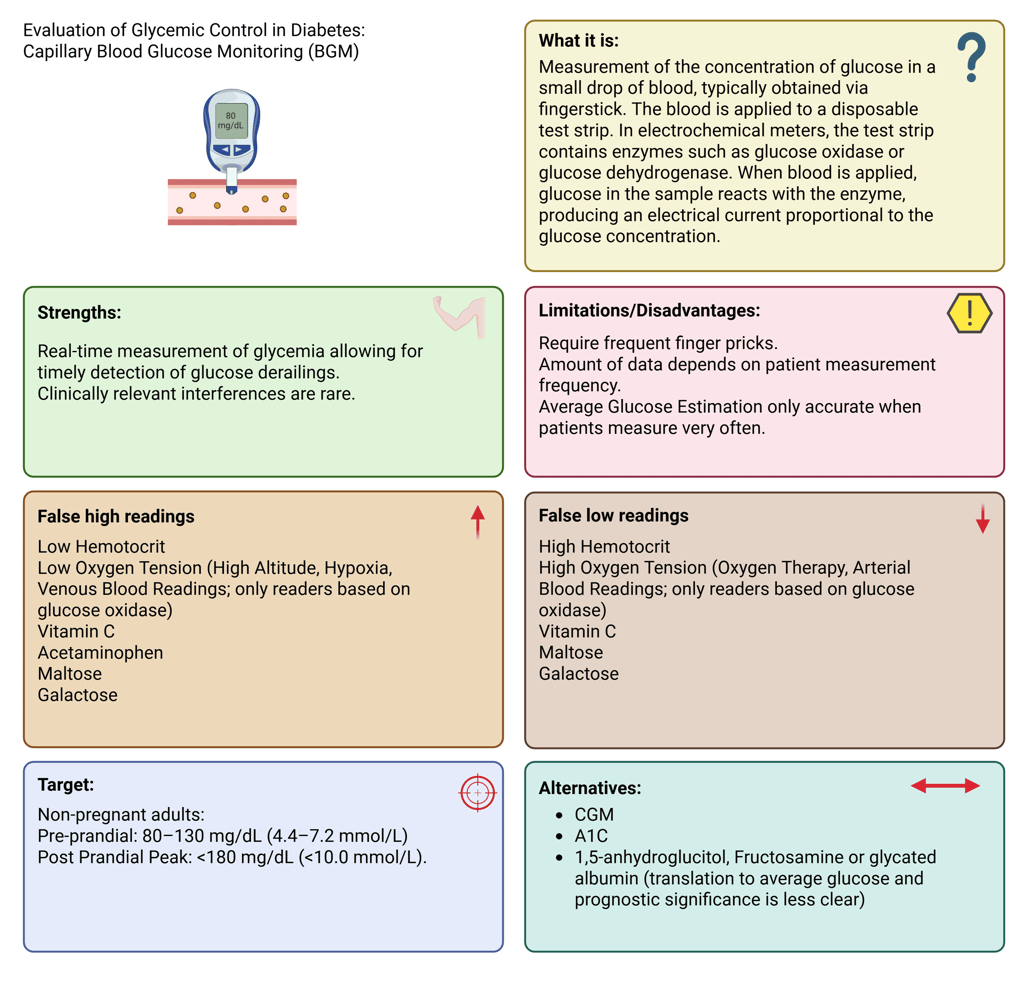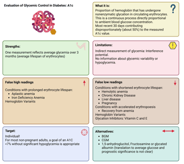 Accurate evaluation of glycemic control is a cornerstone of diabetes management. It provides insights into treatment efficacy, patient adherence, and forms the foundation for therapy adjustments. The major dimensions of glycemic control include average glucose levels, hypoglycemia frequency, glucose variability, and sensor-based metrics such as “time in range.” The most widely applied tools to assess these domains are hemoglobin A1C (A1C), capillary blood glucose monitoring (BGM), and continuous glucose monitoring (CGM), each offering unique strengths and inherent limitations due to how the data are generated.