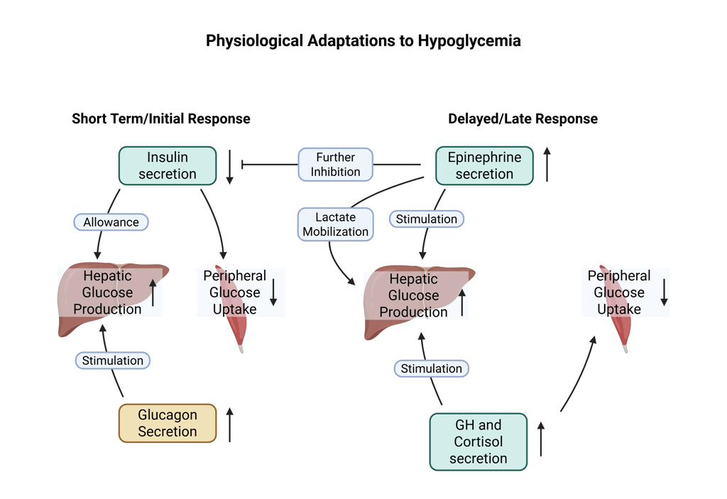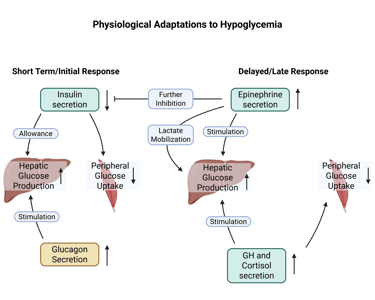 Increased Epinephrine (adrenaline) secretion: Enhances hepatic glucose production, inhibits insulin secretion, and mobilizes substrates für gluconeogenesis (e.g. lactate, amino acids).