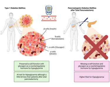 Insulin therapy is the mainstay of treatment for both type 1 diabetes mellitus (T1DM) and pancreatogenic diabetes mellitus (PDM) after total pancreatectomy. Because insulin lowers blood glucose, both groups of patients are at risk of developing hypoglycemia.